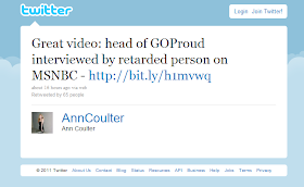 Known witch Ann Coulter saw this video, and used her twitter to call Cenk retarded. Think about this. Not only does she use twitter, but she tweeted the word "retarded." This is further evidence for my theory that GOP talking points are made up by high schoolers.